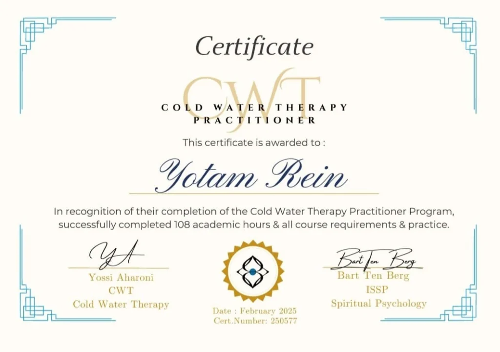 יותם ריין - מוסמך כ־Cold Water Therapist (CWT)